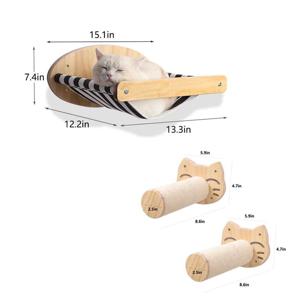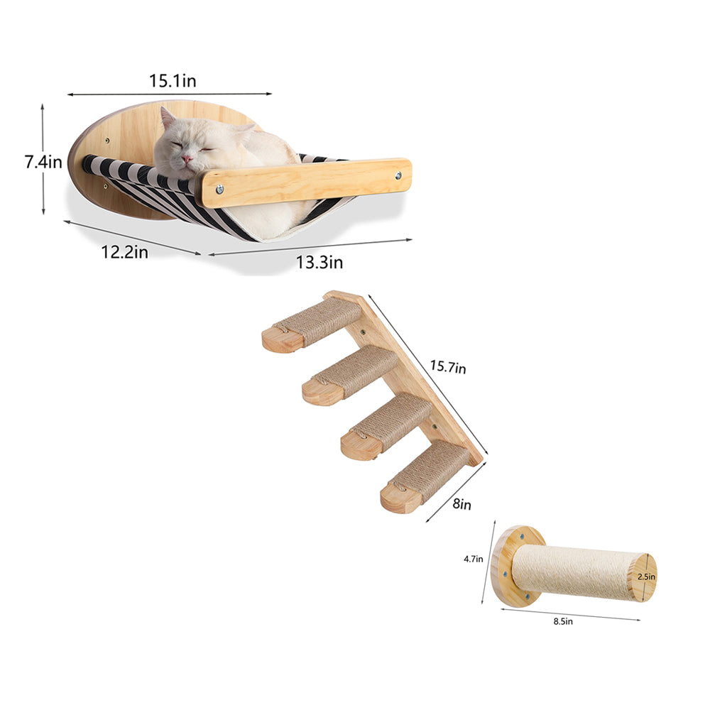 3Pcs Cat Hammock with Four Step Sisal Stairways or Scratching Posts Set Wall Mounted Wooden Cats Furniture Climbing Shelf Perch